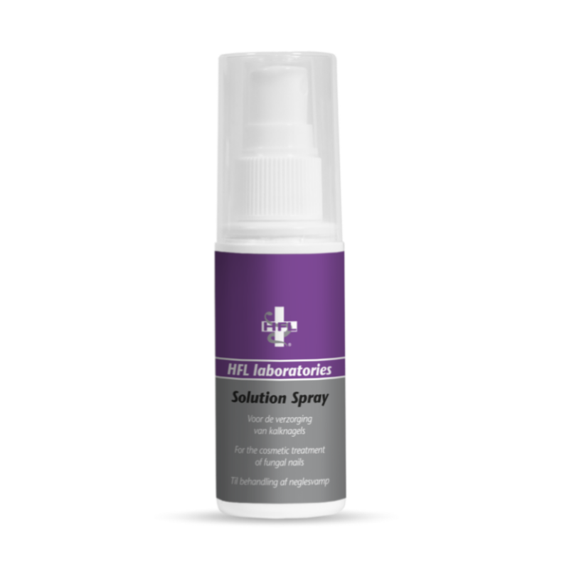HFL Laboratories gepatenteerde Solution Spray is het product voor de cosmetische verzorging van kalknagels die vaak verkleurd of broos zijn. Solution spray draagt bij aan een gezonder uitziende nagel en ondersteunt en beschermt voor een optimaal herstel van de nagel.